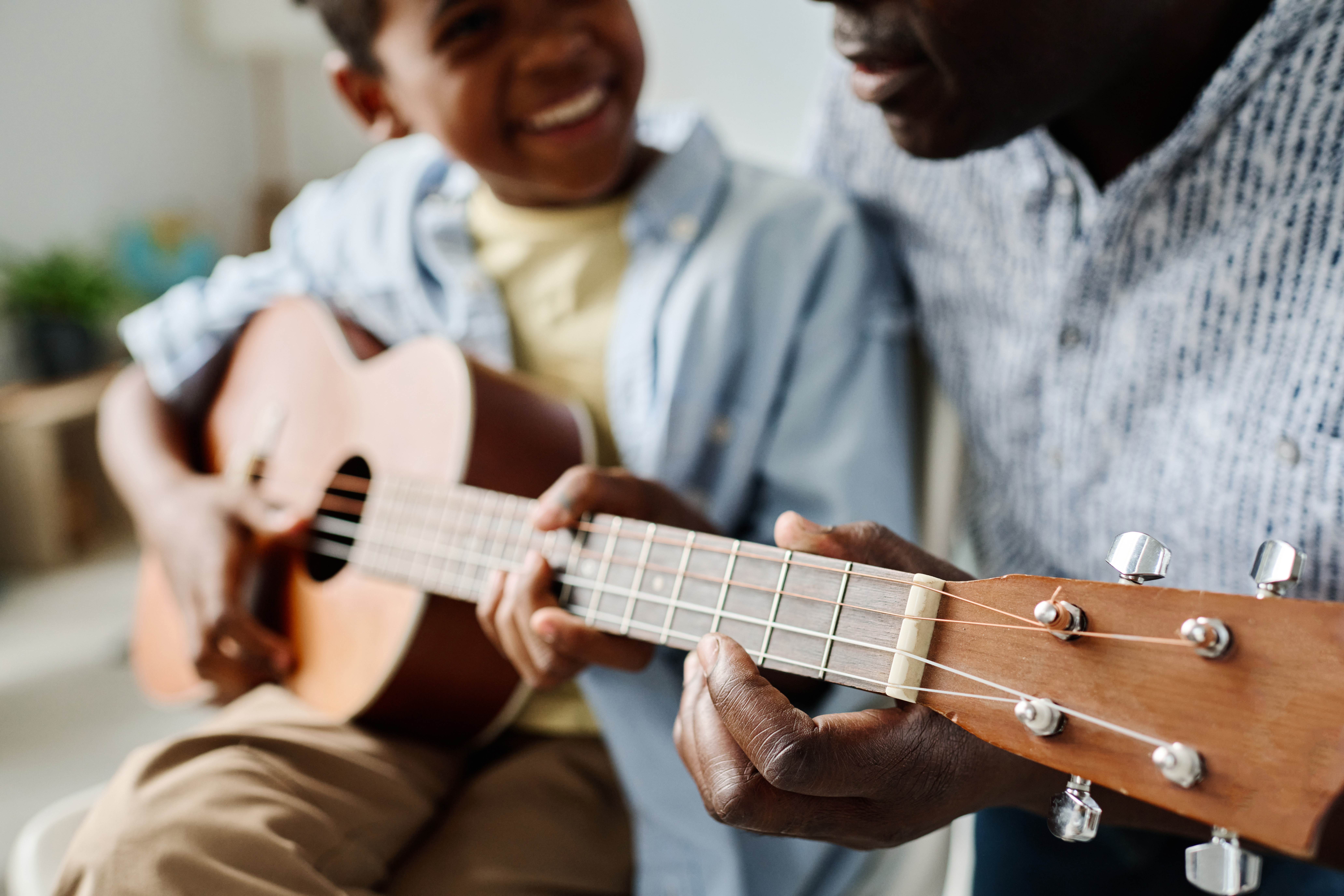 Boy learning to play guitar with teacher