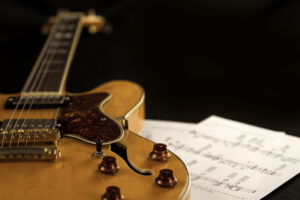 Vintage archtop guitar in natural maple close-up high angle view with music sheets on black backgroundBy TREND Entertainment Group / January 16, 2026