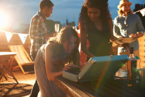 Woman putting on music at early evening party